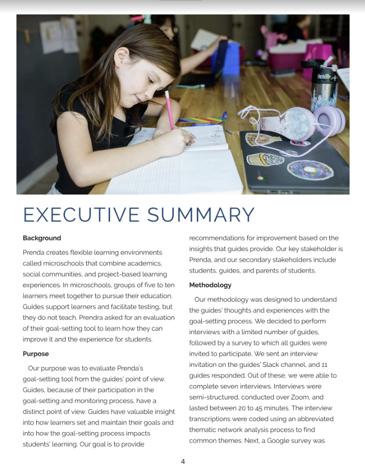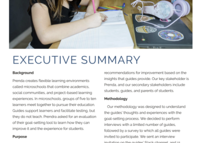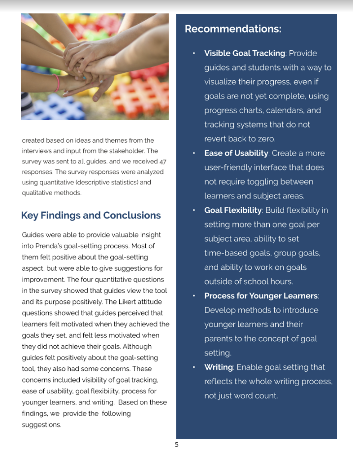 We recommended Prenda create a more user-friendly system, add in more flexibility, add an improved method for younger students to set goals, and a goal-setting method better aligned with outcomes in learning writing. Our client was pleased with the report and found the recommendations to be useful.