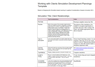 - Client Interaction: Students are in a contract designer position where they interact and make decisions with a client. Students face five of the most common trouble spots with instructional design clients. The simulation is completed in small groups, followed by a class discussion and an individual reflection.