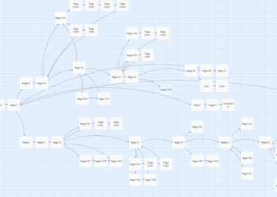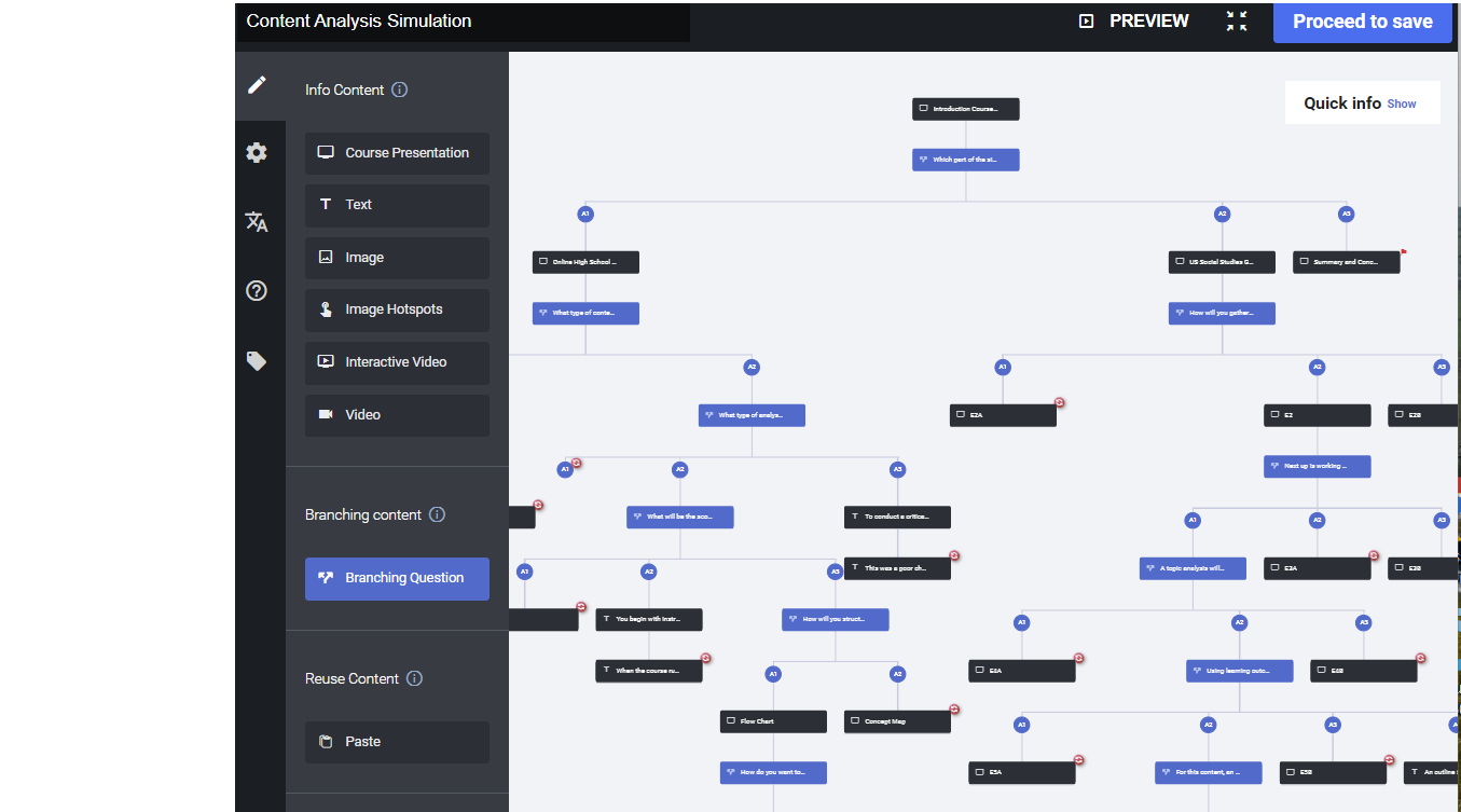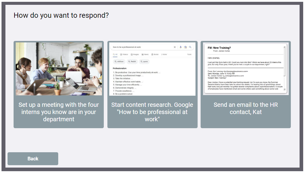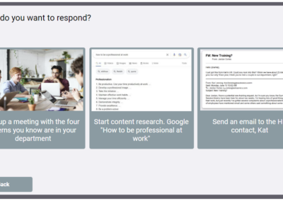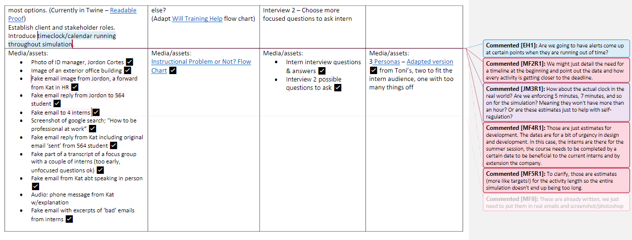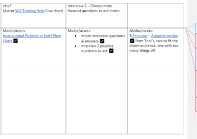 - Planning – I planned each simulation using Simulation Development Planning worksheets and branching scenario designs in Twine. One design was built in Smart Builder by a developer and I developed the other two in H5P.