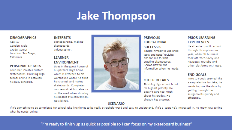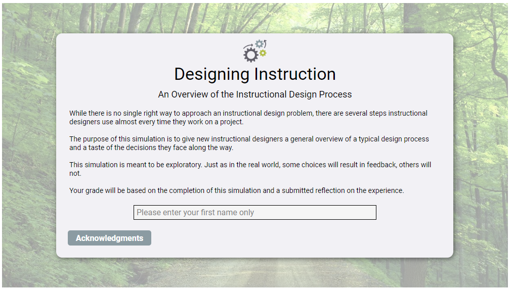 Students in an introductory instructional design course needed an overview of the instructional design process and experience making decisions when interacting with clients and creating content analyses. The designs needed to be authentic and relatable but allow students to make mistakes in a safe situation