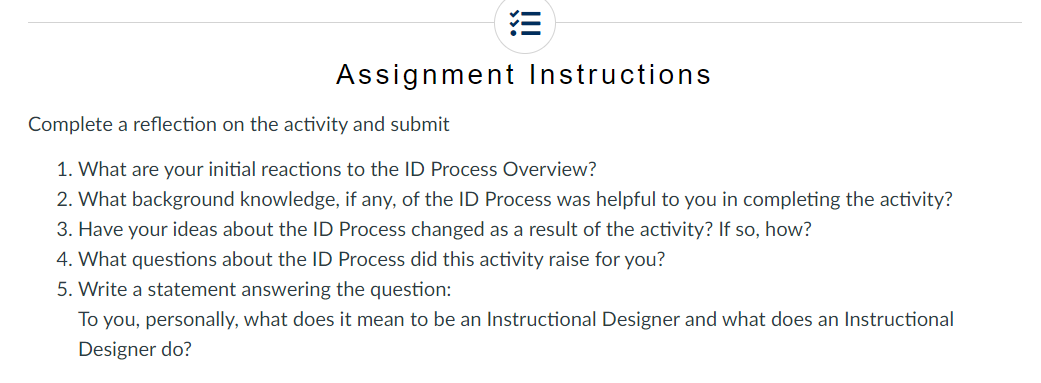 - ID Process Overview: This simulation is situated in an authentic context of a corporate ID developing a short course for a company. In small groups, students complete small portions of the process, followed by a class discussion and individual reflection.