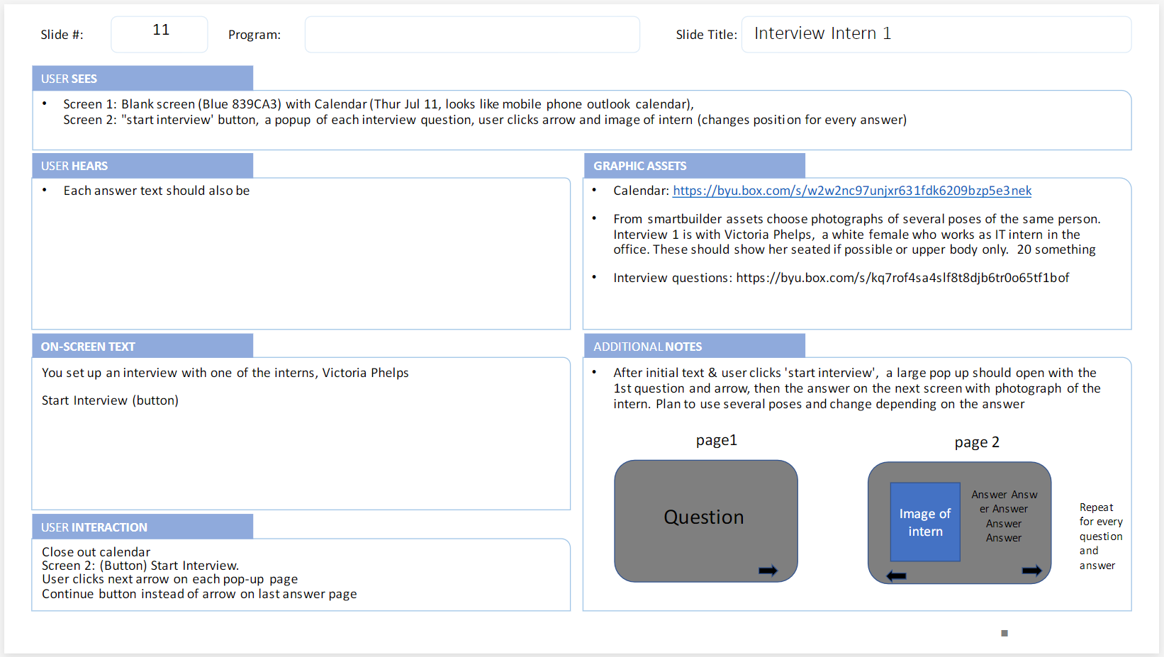 Storyboard example showing what user sees/hears, how they interact, graphic assets and layout notes for the developer