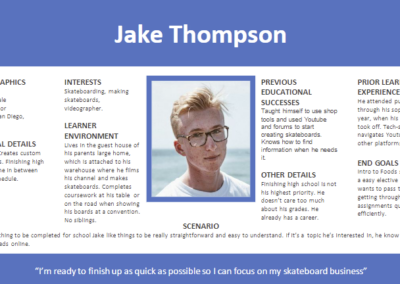 - Viewed the content of the course as a whole and then broke down elements of the process into simpler parts that included an authentic skill needed to complete the element. For example, students watched a very brief prototyping video and then added the problem and suggestions for changes to a prototype report document.