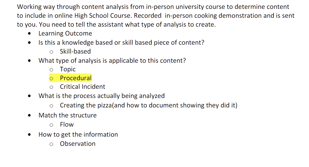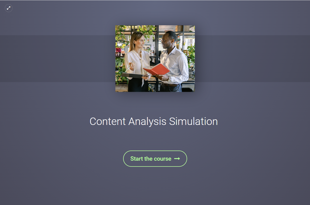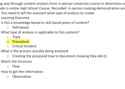 - Content Analysis: Through two separate scenarios, students are tasked with deciding on the type, format, and content-gathering methods for a procedural analysis and a topic analysis. Again, students complete the simulation in small groups, followed by a class discussion and an individual reflection.